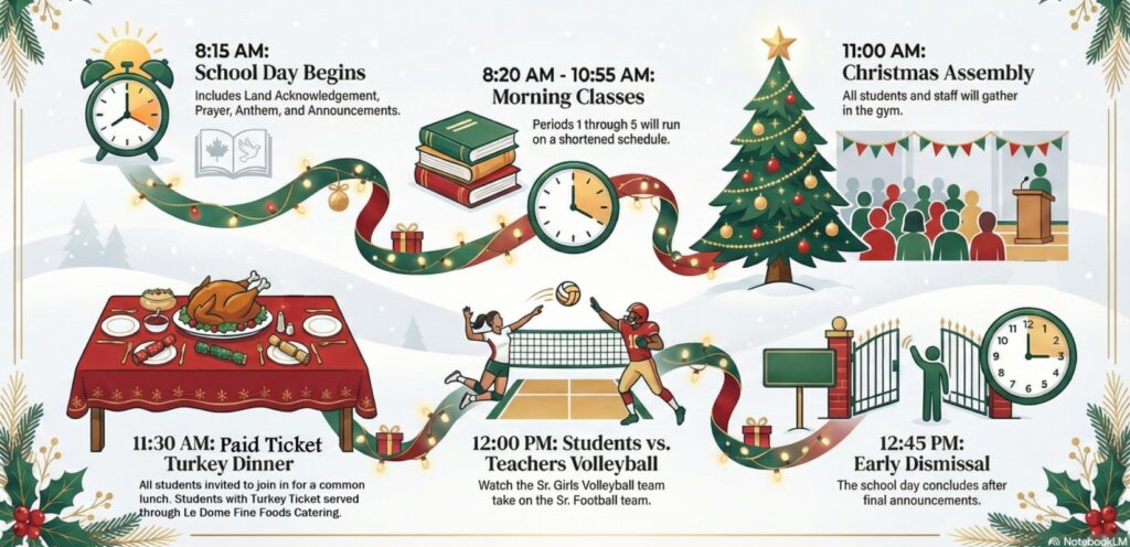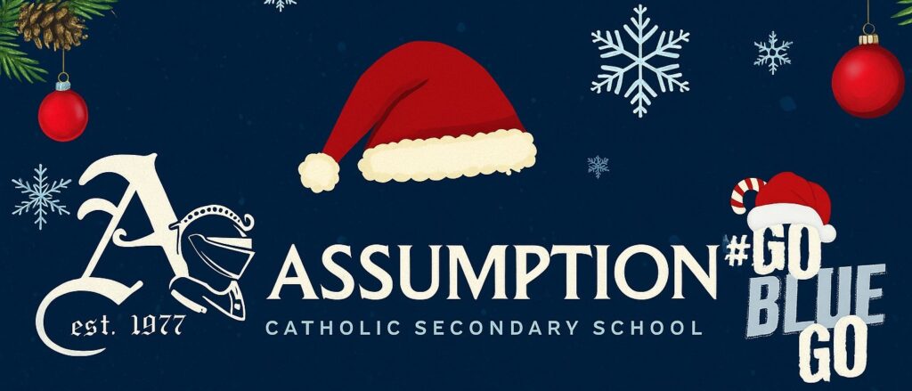 I’m writing to share an overview of our Spirit of Christmas Day taking place on Friday, December 19. This will be an early dismissal day across all HCDSB schools, with Assumption dismissing at 12:45 p.m. The full agenda for the day is attached for your reference.