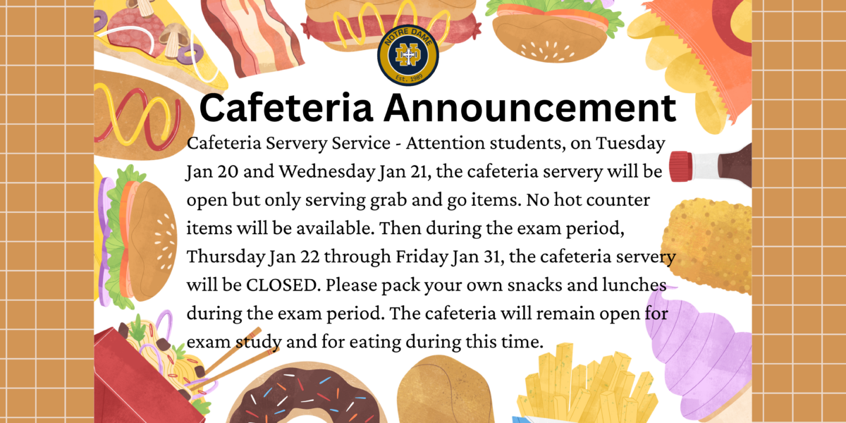 CAFETERIA ANNOUNCEMENT – The cafeteria will be CLOSED during Semester 1 Exams, starting January 22nd and will re-open on February 2nd , the first day of 2nd Semester. Thank you and we appreciate your understanding!